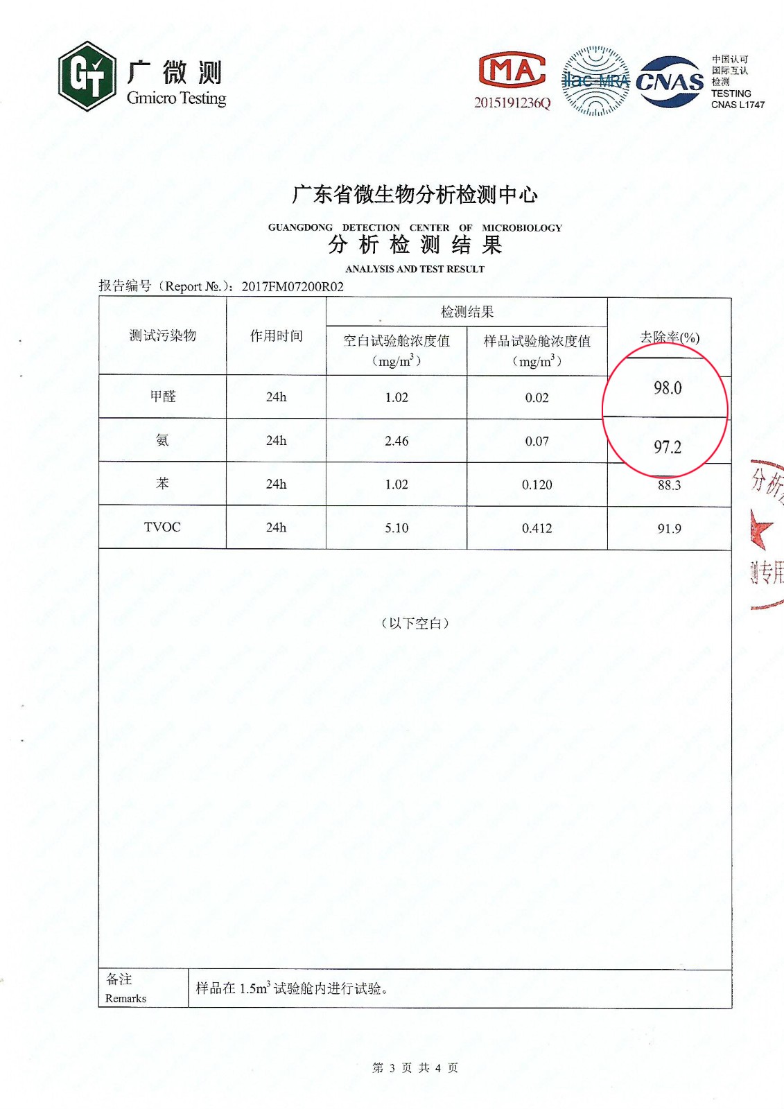 甲醛净化剂除醛率检测报告